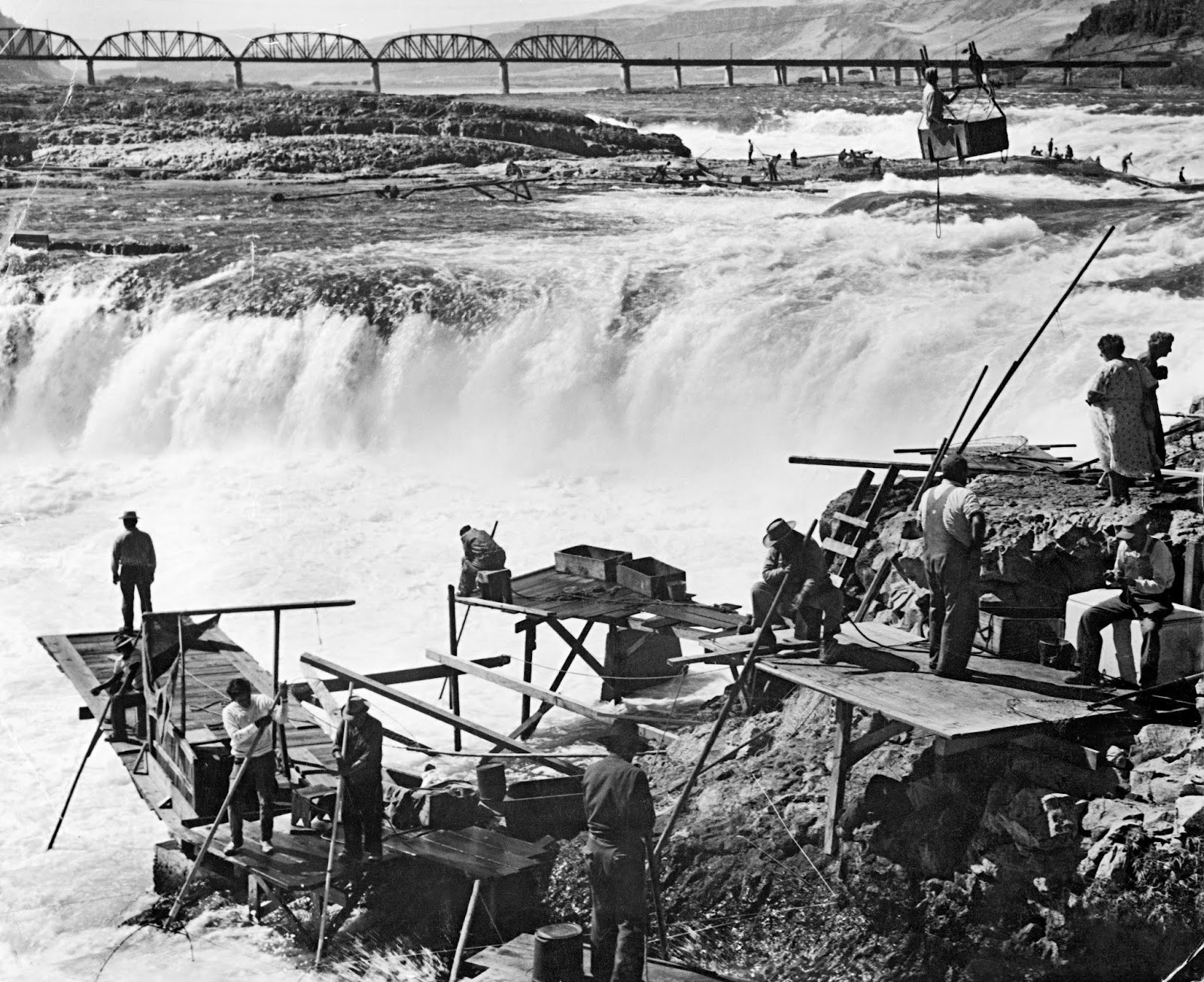 | Fishing at Celilo; Railroad Bridge in background |