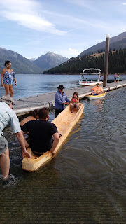 Six of us hoisted it onto James Montieth’s pickup bed, and the six of us lowered it into the water at the boat dock on the north end of Wallowa Lake. There was a big, fancy powerboat across the dock from us, but our craft immediately attracted attention and drew a crowd of 40 or more, including a raft of kids who wanted to try it out.