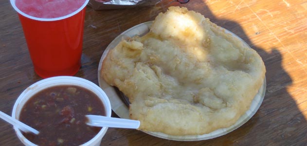 So frybread is a kind of middle finger at the white world—“this is what you left us; well, we will survive on it”—and it has become a symbol of Indian unification across tribal boundaries. But it is also, as Harjo pointed out, a symbol and a fact of the short end of the treaties dealt Indians—the exchange of healthy foods and ways of life for lives of dependence and white people’s diseases. Like many things in Indian Country, complex and many-sided.