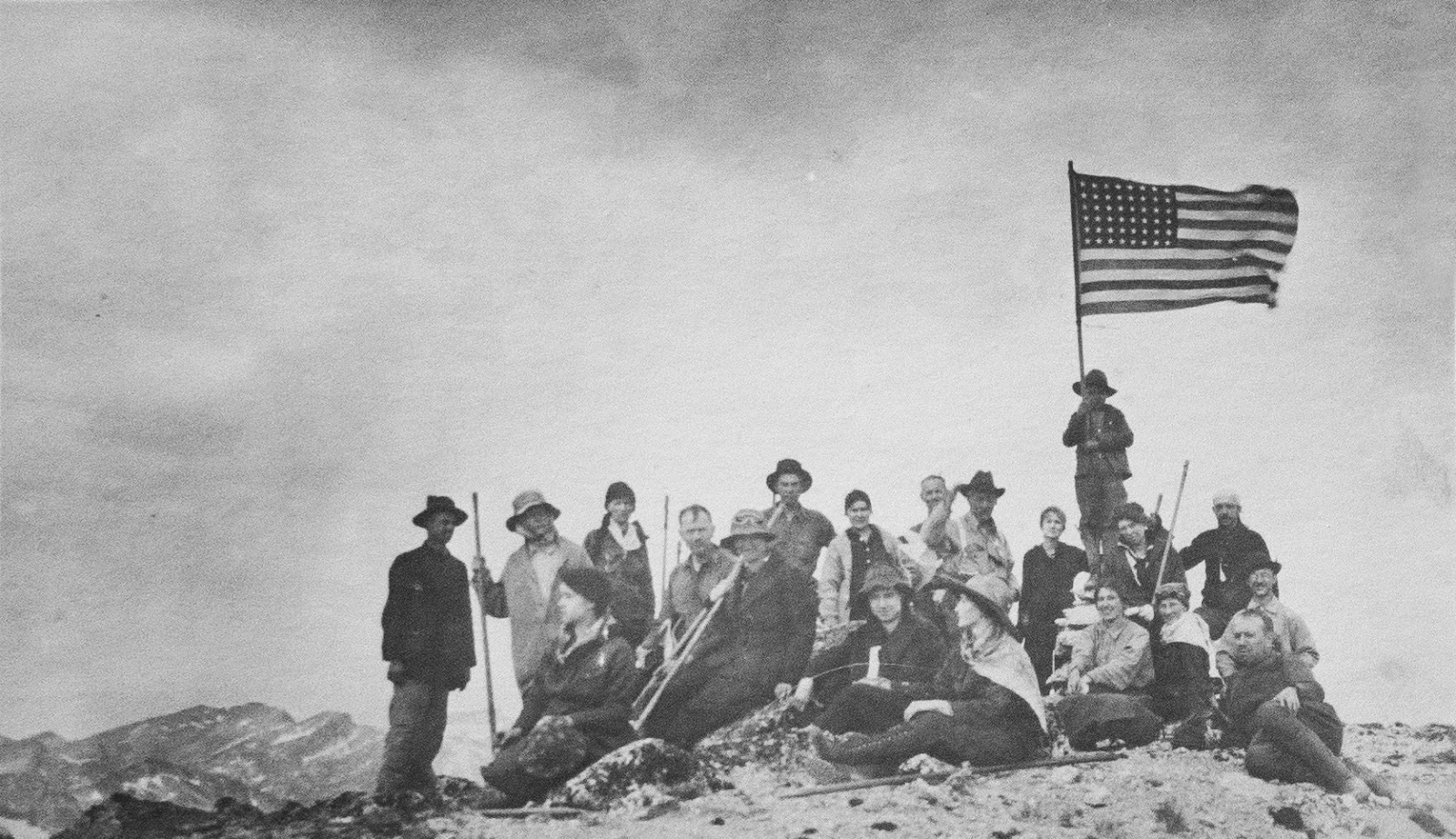We know all this because one of the hikers was Lola Creighton, who wrote it up for the Mazama journal she’s to the viewer’s left of the man holding the flag). And we know that because two of her granddaughters—one from the Midwest and one from California—met here this summer with their daughters to show the young women where their-great grandmother had been and what she had done in 1918.